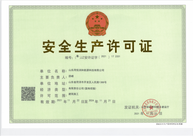 近日,菏投潤和能源科技有限公司安全許可證獲山東省住房和城鄉(xiāng)建設(shè)廳正式頒證,截止到2021年12月,菏投潤和能源科技有限公司已獲得安全生產(chǎn)許可證、承裝(修、試)電力設(shè)施許可證、建筑業(yè)企業(yè)資質(zhì)證書(電力工程施工總承包三級、機電工程施工總承包三級)三項證書,這意味著公司步入了一個全新的發(fā)展階段。
